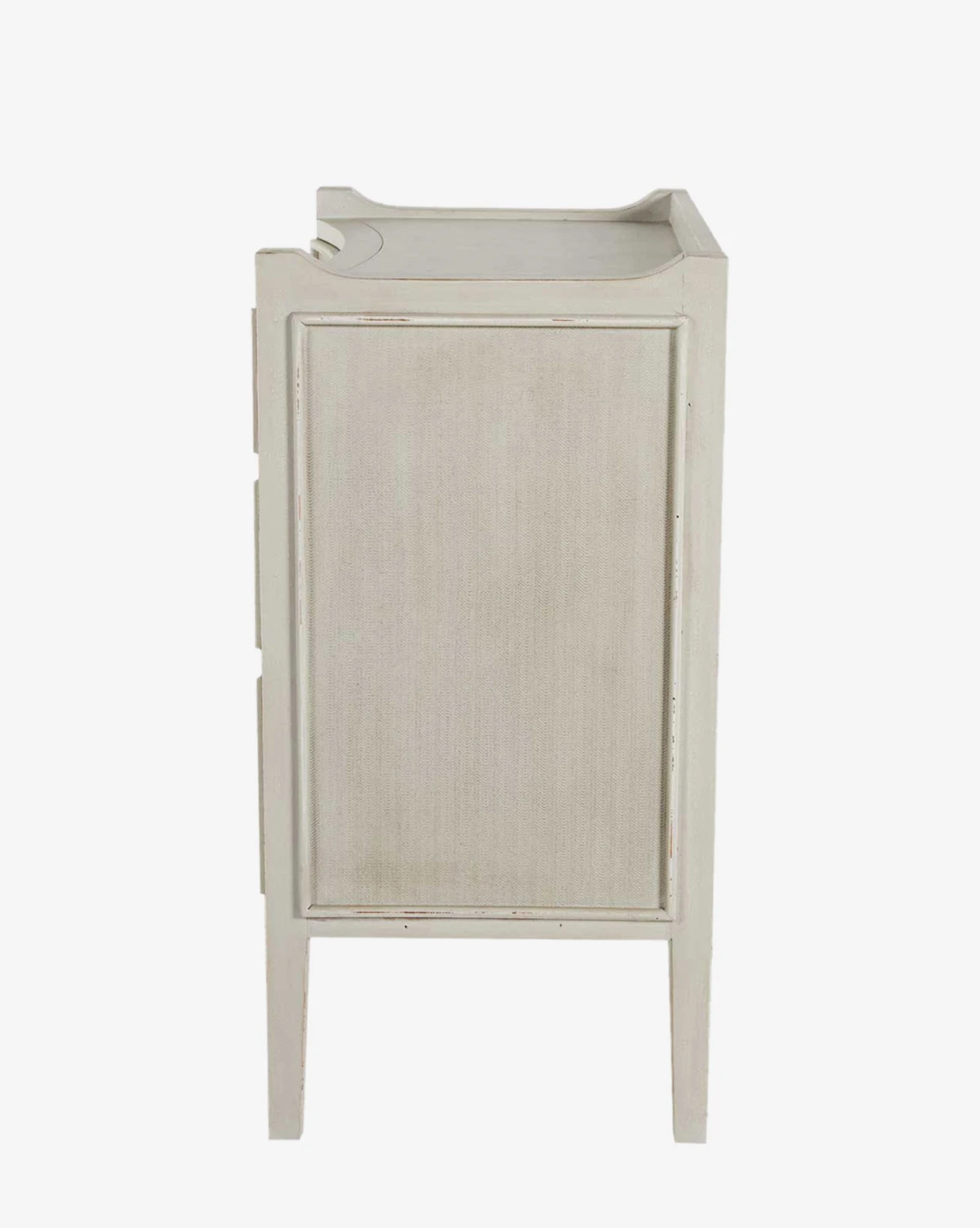 Made from oak, the Shai Chest is simple in style and features drawers ascending in size. With a curved front and shaped top border, the structure of the chest adds intriguing dimension. Burlap fabric covers the front of each drawer for added texture and character.