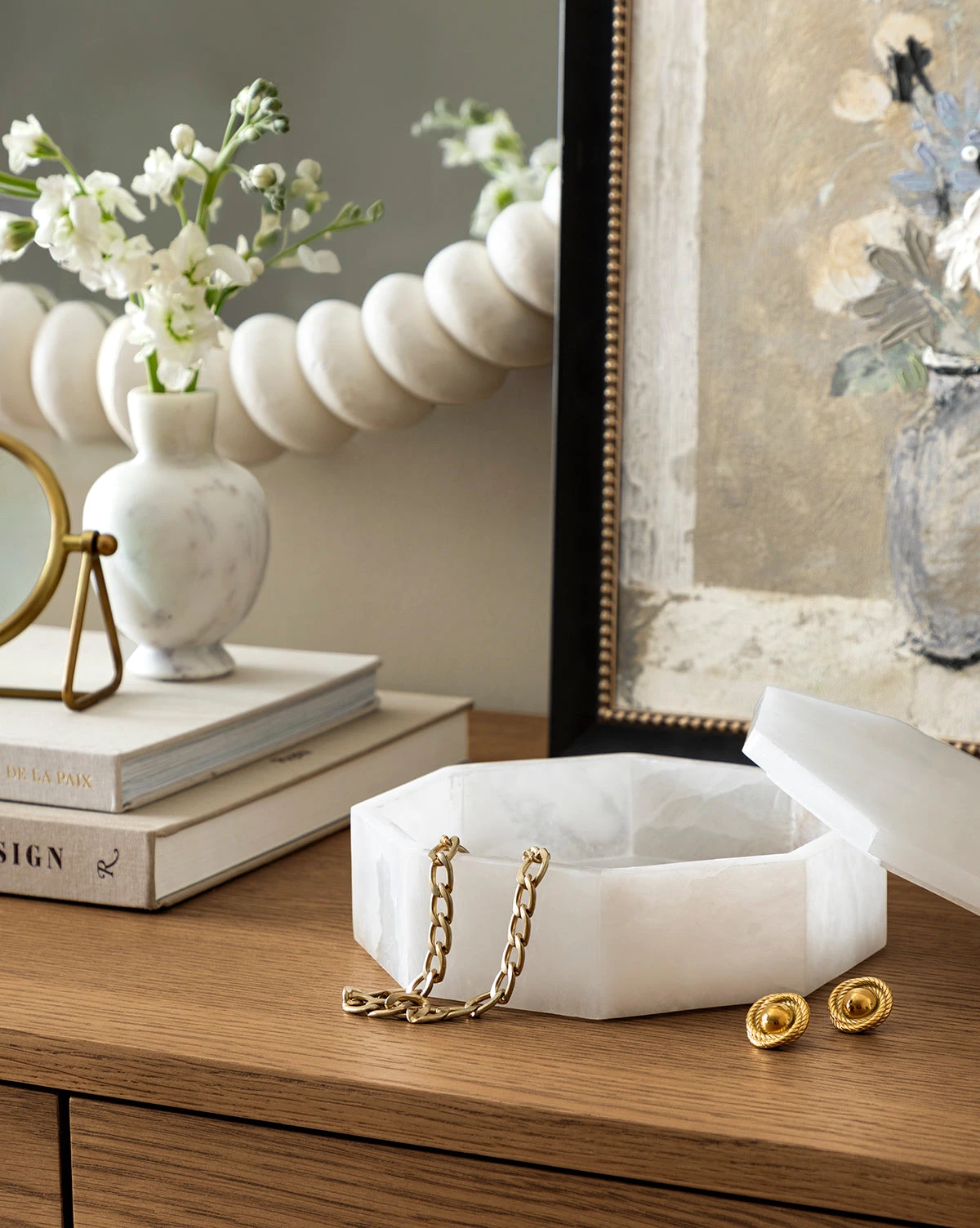 From its octagonal shape to its natural details, the Sonya Alabaster Box makes a statement. Styled on a console or built-in, the honed alabaster box seamlessly elevates existing decor with its shapely and abstract feel.