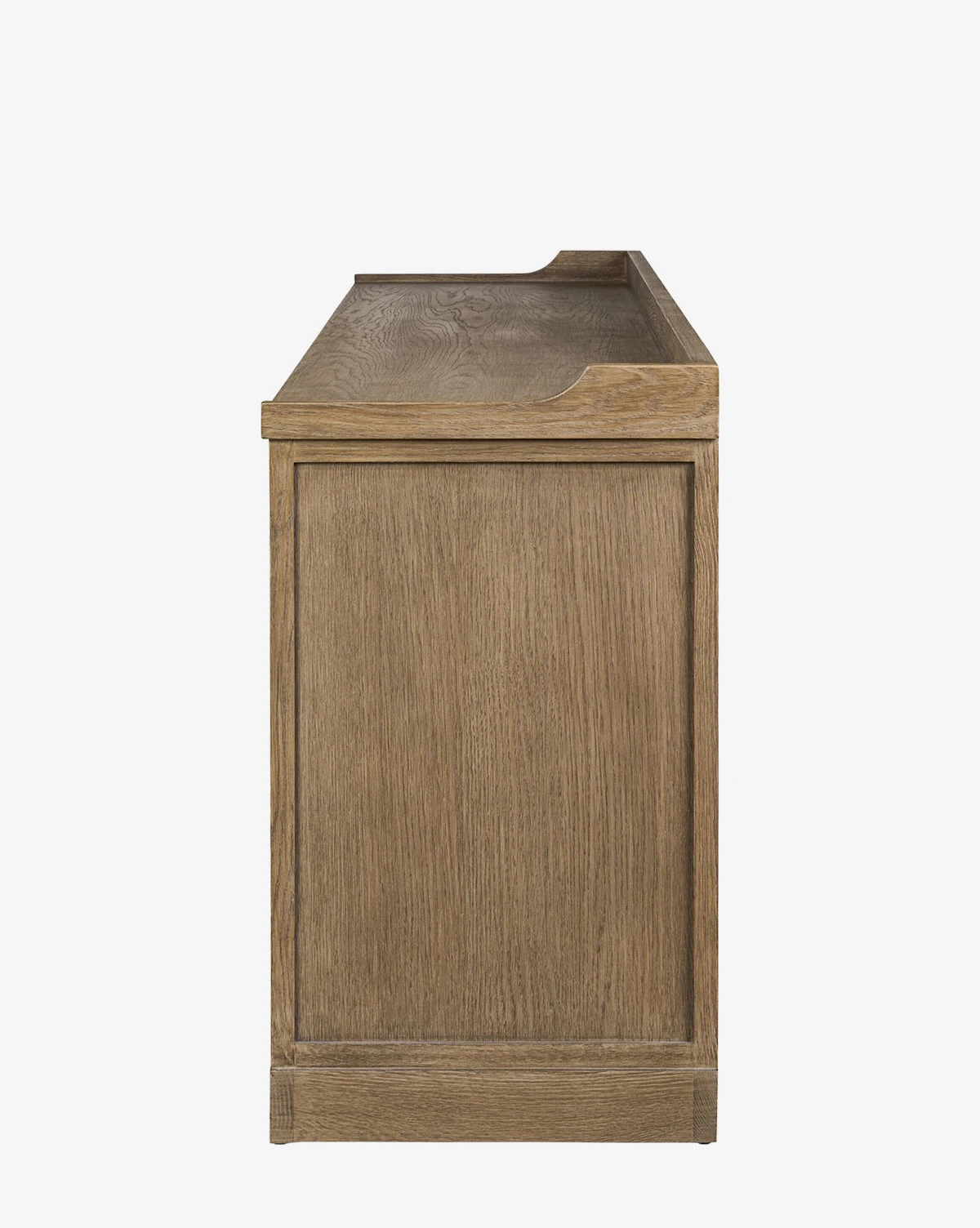 A timeless form reimagined, the Stonington Oak Sideboard features a distinctive gallery-style top and a beautifully weathered washed oak finish. Functional locks on the doors and aged bronze hardware add vintage-inspired charm, blending classic design with thoughtful, elevated details for a collected, refined look.