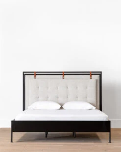 The Sutherland Bed brings an industrial yet cozy style to the bedroom. A padded, raised gray headboard gives dimension to the piece, with leather details that warm the palette. Held in a nuanced, black-metal frame that gives layers to this stunning bed, the Sutherland Bed brings design detail and warmth to elevate the style of any bedroom space.