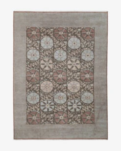 Hand-knotted with neutral brown tones, our Suzani Hand-Knotted Wool Rug is welcoming and sophisticated. Its wide border frames a unique floral motif. Made with 100% wool, the rug anchors any room and complements your decor, remaining durable for years to come.
