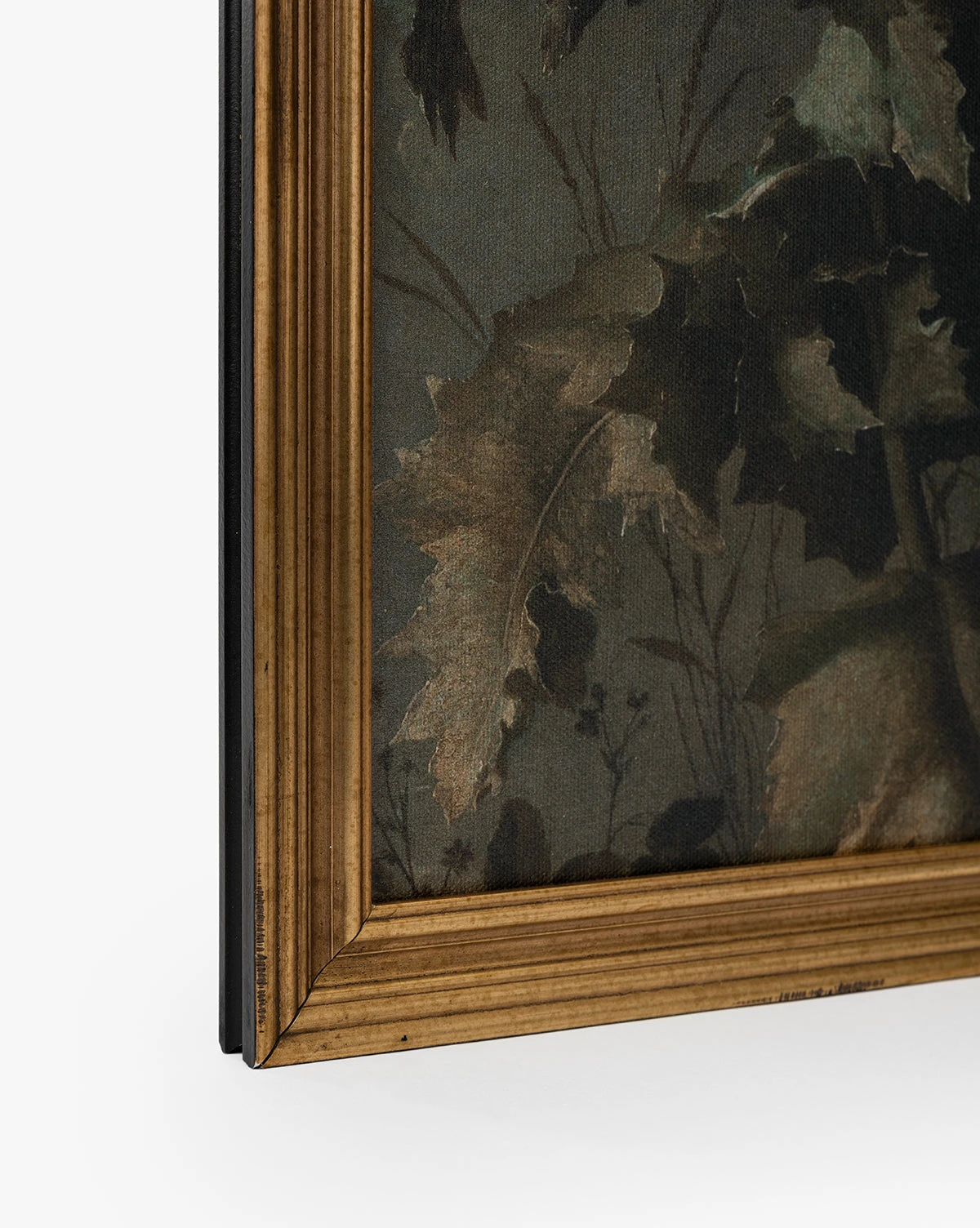 In a moody palette, Thistle Down depicts a unique and shapely plant with a flower in full bloom. Bringing an expressive feel to your walls, the piece is presented on canvas within an antique gold frame. Â