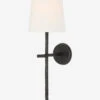 Streamlined yet inviting, the candelabra-style TT Single Sconce is available in four beautiful and traditional finishes. The gently curved arm is mounted to a rectangular backplate, lending refinement and balance to your decor.
