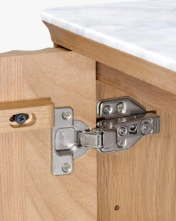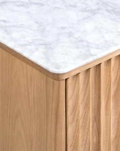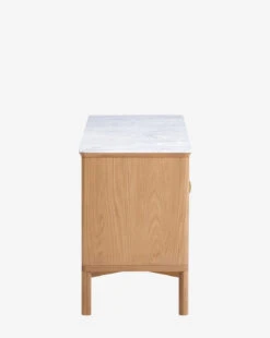 The Vale Sideboard elegantly blends materials, setting the mood for your entryway vignettes. With a textural oak front and a white marble top, this sideboard features spacious shelving and is complemented by antique brass hardware.