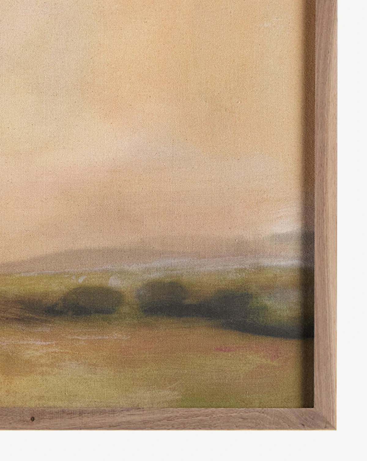 A calming landscape with a colorful and ethereal composition comes to life with each brush stroke in Warm Countryside. By artist Dan Hobday, this piece is a print on raw canvas within a walnut-finished frame, lending character and gallery-quality materials to your space. Â