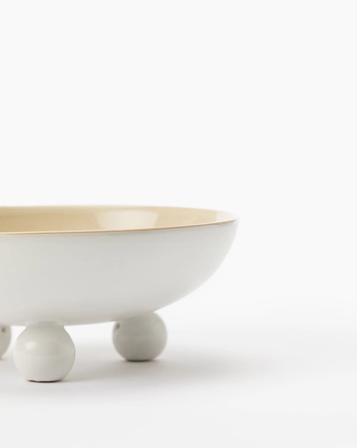 A wide circular bowl stabilized on three spherical feet, the White Ball Footed Bowl is a fun lesson in balance. The outer white glaze is contrasted with a natural interior, allowing this lovely ceramic piece to serve as either an artistic accent or functional vessel.