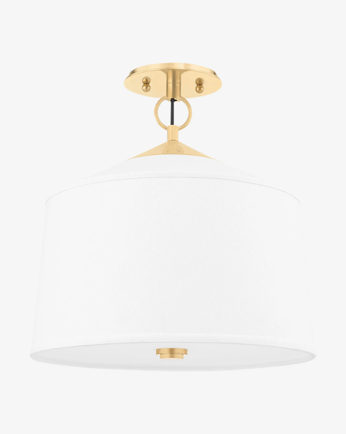 With an unmistakable silhouette, the White Plains Semi-Flush brings new light to classic designs. A frame of aged-brass metalwork complements a dramatic drum shade, which is topped with a beautiful conical finial. Its enclosed shade diffuses the light in a soft glow, creating an ambience in your space that is endearing and elegant.