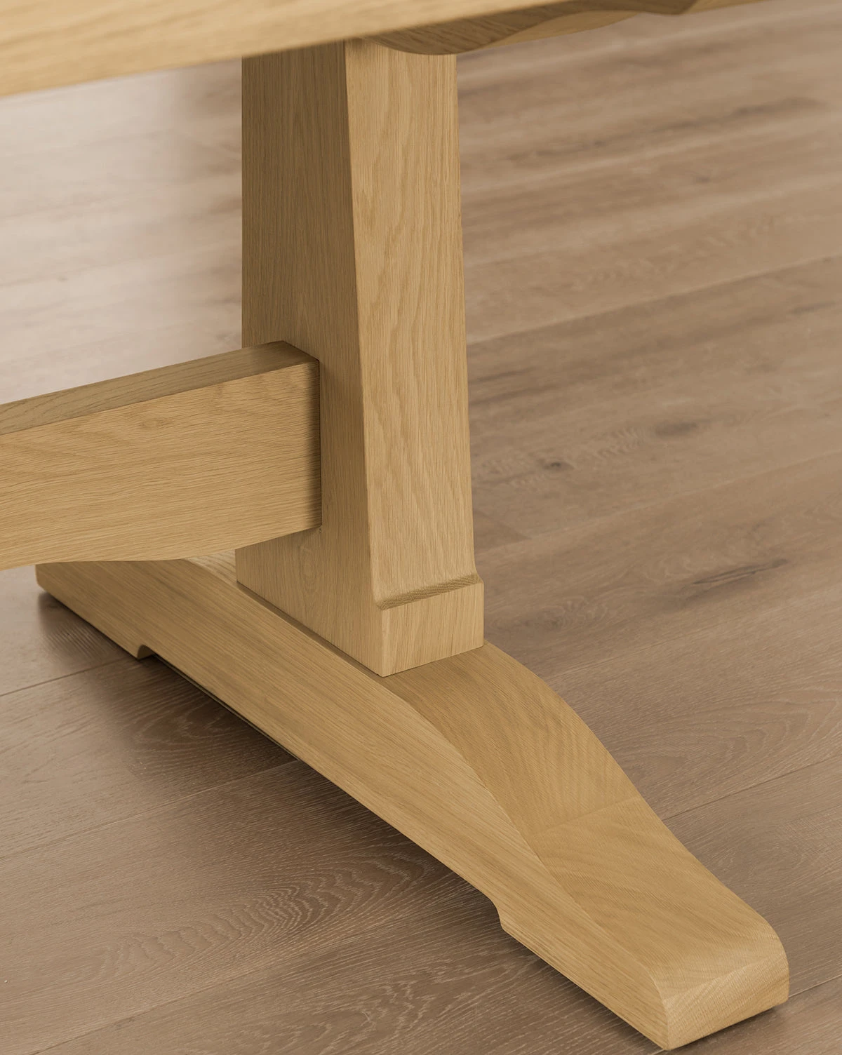 Crafted from oak with a heritage white oak finish, the Wilton Dining Table brings both form and function to your dining space. With its architectural inspiration and timber framing details, its high-quality construction stands the test of time. Â