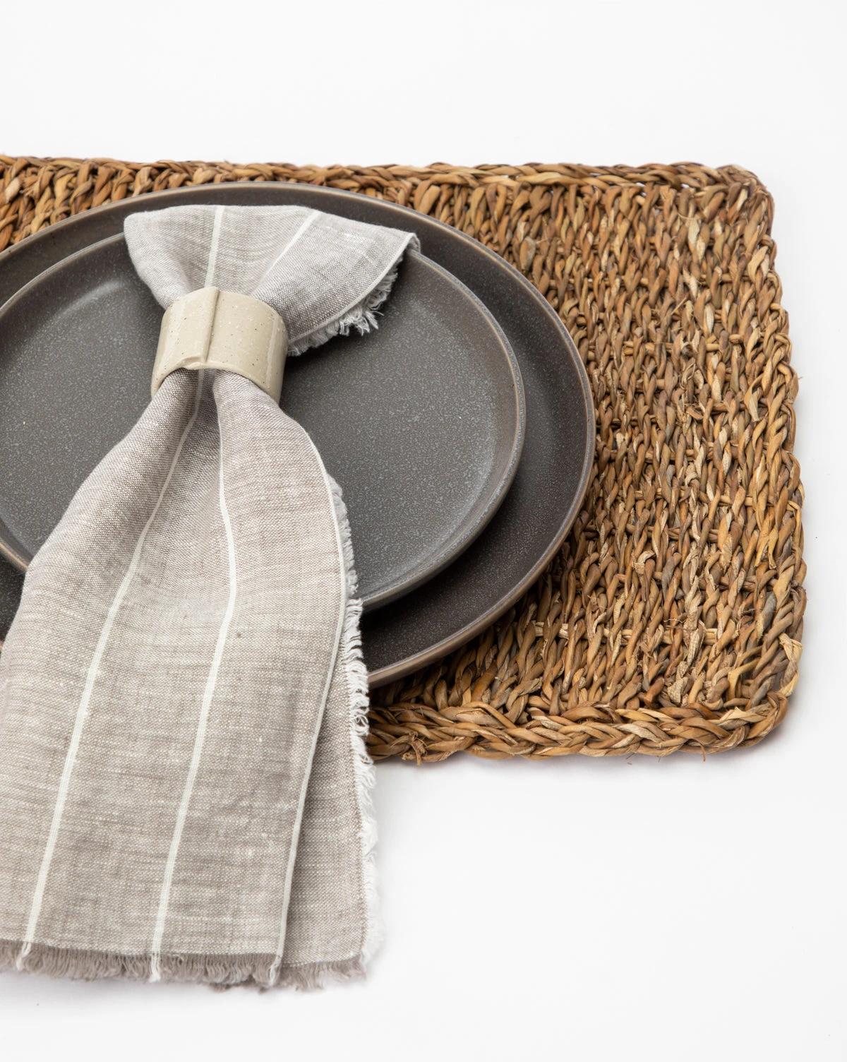 Highly textural, the Woven Seagrass Rectangle Placemat has a loose weave of natural seagrass that gives a pronounced organic feel to table settings. Its coastal quality is balanced by a warm natural tone and braided design, lending a refined, playful feel to your dining spaces.