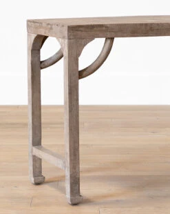 The Youngman Console Table has unique architectural details that bring a rustic playfulness to your space. Inspired by a traditional console, the Youngman Console Table uses small archways in its interior corners as a refreshing update to this timeless piece. Its wood frame is finished with light gray undertones, which adds versatility and depth to its aesthetic.